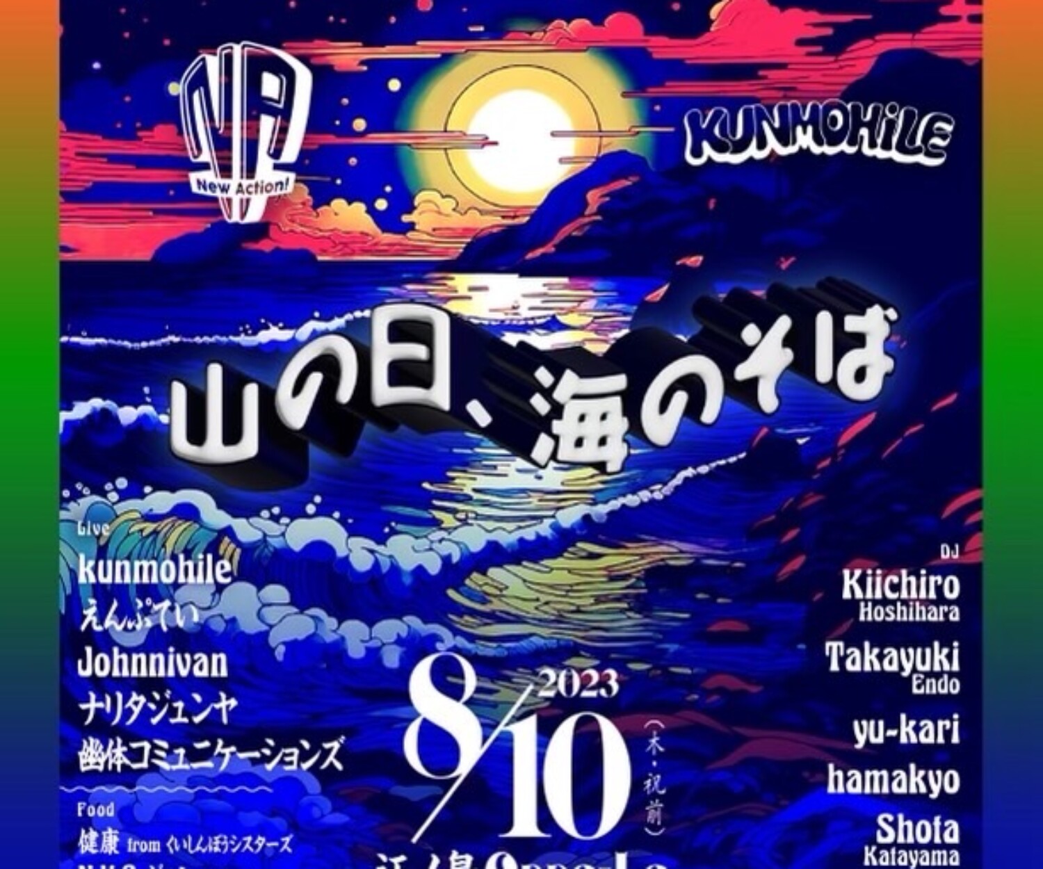 live/dj, NEWS, Schedule 15 6月 2023 2023.08.10.THUNew Action! × kunmohile presents “山の日、海のそば” New Action! × kunmohile presents “山の日、海のそば" 2023.8.10 (木・祝日前) @江ノ島Oppa-La open/start… HIMITO