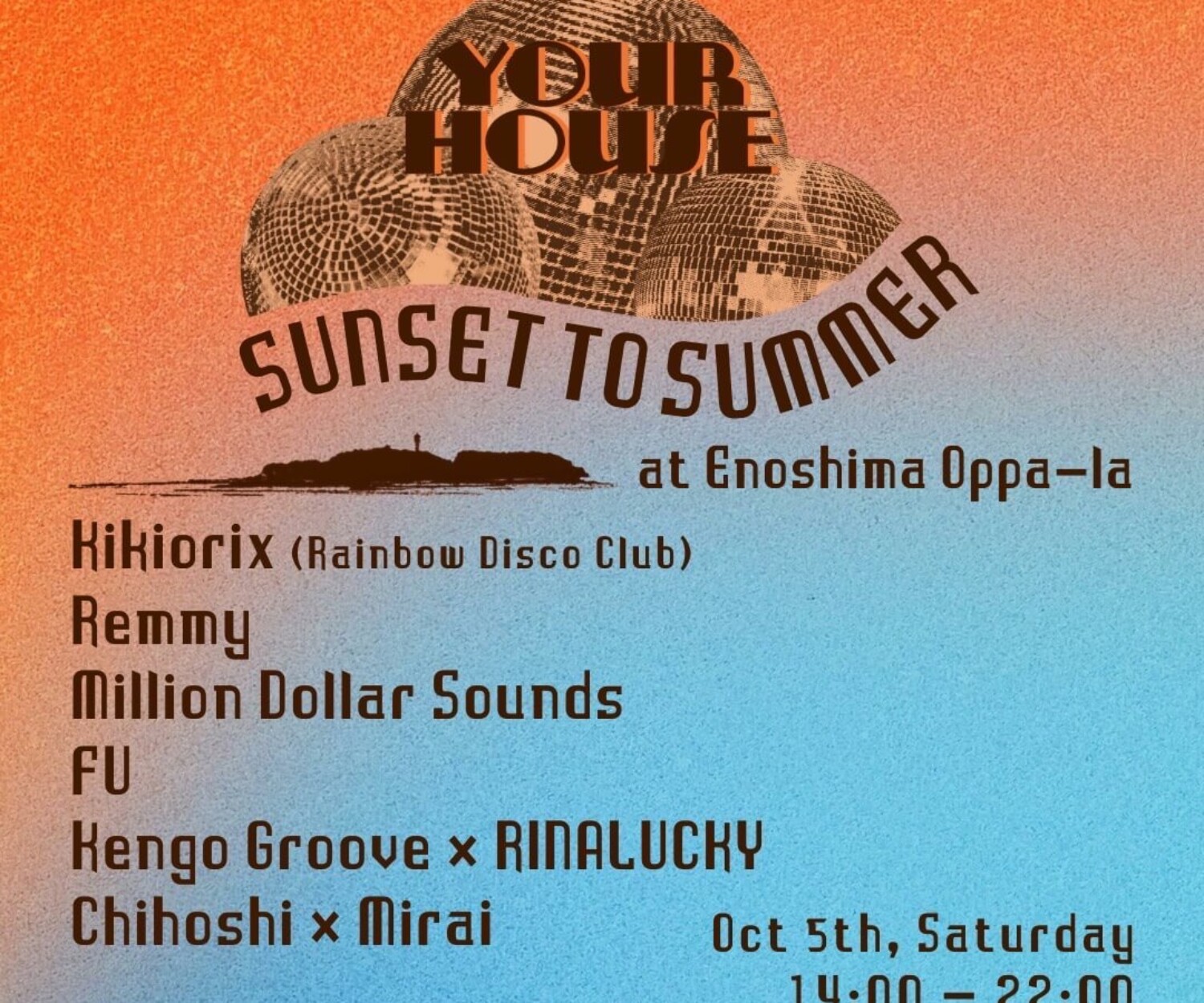 live/dj, NEWS, Schedule 20 9月 2024 2024.10.05SATSunset to Summer 夏の熱狂をもう一度。 心地よいHouseとDiscoに包まれながら夏をサンセットするYOUR HOUSE SUNSET TO SUMMER。 DJ HARVEYも愛する江ノ島Oppa-laにて、 若手とベテランで織りなすサウンドが特別な一体感を生み出し一日の終わりを美しい音楽で彩る。 ゲストにはRainbow… wac